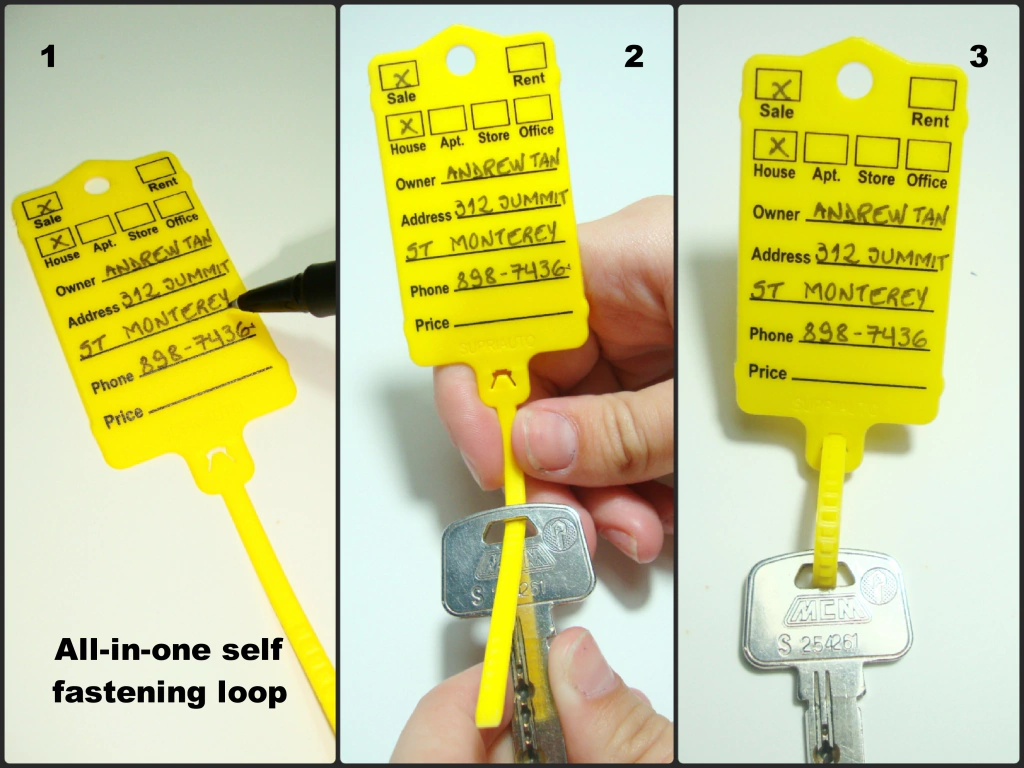 The Supriauto Vehicle key tag is designed for use in all areas of the dealership. The key tag is attached to the key with a self-looping tail and is available either blank (plain), with pre-printed vehicle information, or with your own businesses personalized printed message(Additional Charges Apply). Self-looping tail key tags are available in a variety of colors including yellow, light blue and white.